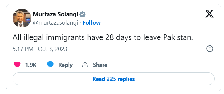 El ministro de Información interino, Murtaza Solangi, dijo: “Las agencias de inteligencia y las LEA (de Pakistán) encontrarán (a los inmigrantes ilegales) y las autoridades incautarán esas propiedades y negocios. Los pakistaníes involucrados en esta facilitación serán sentenciados según la ley”.