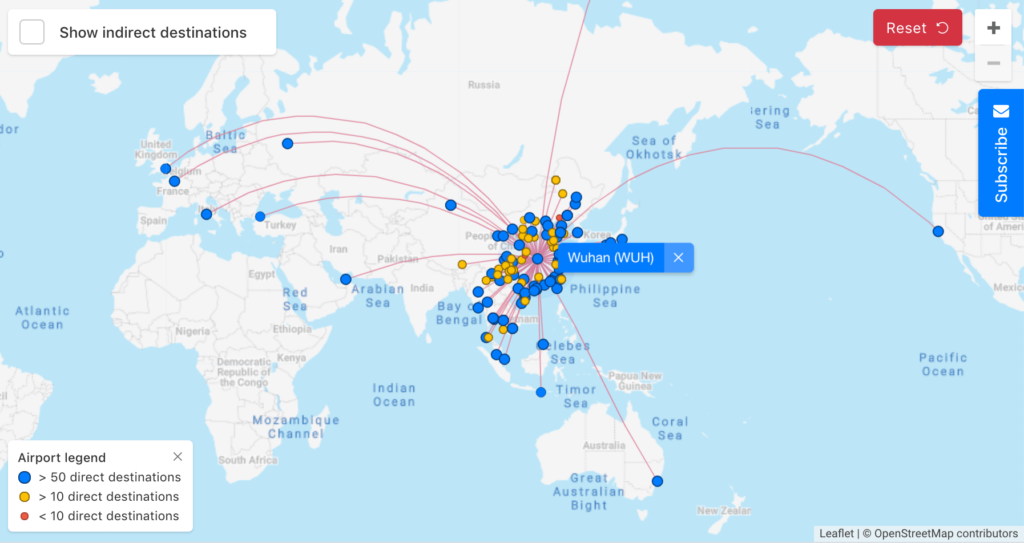 Vuelos directos desde Wuhan cortesía de flightconnections.com Inicialmente, se cree que el virus infectó a personas que trabajaban o visitaban el Mercado Mayorista de Mariscos Hua Nan, donde se sacrifican animales vivos en la ciudad de Wuhan. Sin embargo, la rápida propagación del virus confirmó que está ocurriendo transmisión de persona a persona. La propagación de persona a persona ocurre a través del contacto cercano con personas enfermas que generan aerosoles del virus al toser y estornudar. El virus que queda suspendido en el aire es luego inhalado por una persona sana.