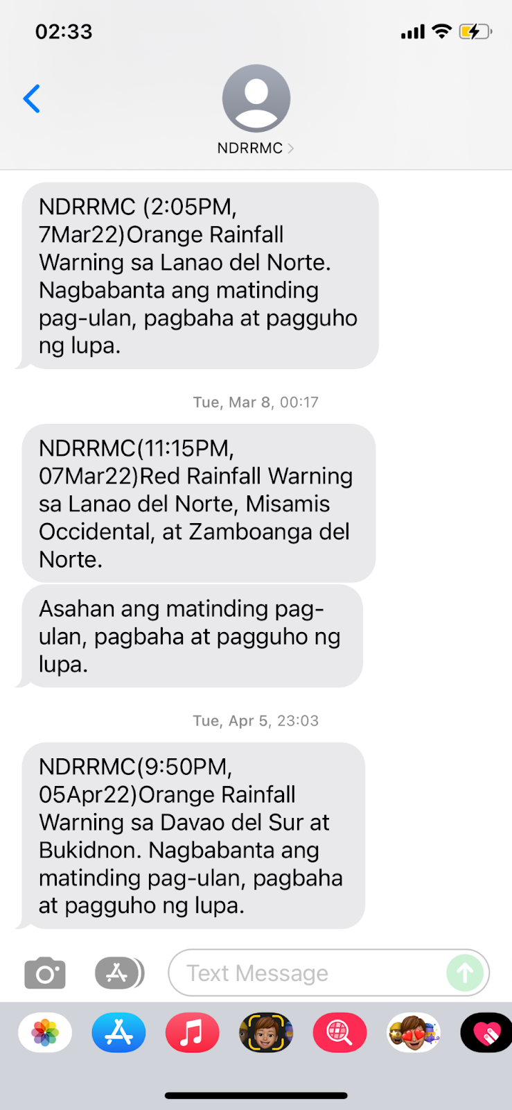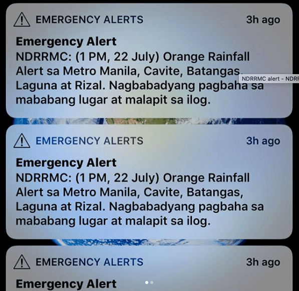 جايلين: في بعض الأحيان، يتم إرسال تحذيرات عبر الرسائل القصيرة من قبل المجلس الوطني لإدارة وتقليل مخاطر الكوارث (NDRRMC)، ولكن في أغلب الأحيان تظهر لدينا تحذيرات منبثقة أو تحديثات للطقس على هواتفنا مع رنين عالٍ واهتزاز مستمر حتى نقرأ الرسالة.